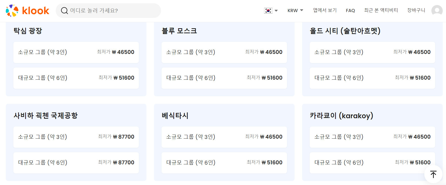 클룩 상품이 좀더 저렴하고 선택지가 넓어서 이용할만 해 보인다. 탁심광장까지 이코노미 차량 4인승으로 최저가 46,500원 정도이다. 공항에 도착해서 헤매는 과정을 최소화하고 싶다면 고려해볼만한 방법이다.