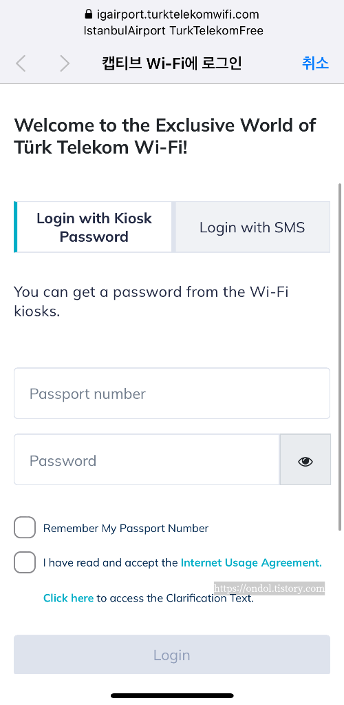 그리고 와이파이를 연결하면 이런 창이 나온다. Login with Kiosk Password를 선택하고 여권번호와 무료코드를 입력하면 1시간동안 와이파이 사용이 가능하다.