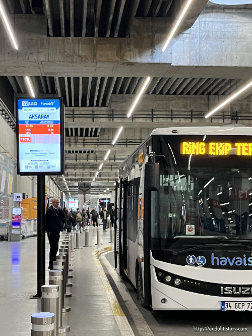 악사라이 방면은 12번, 탁심 방면은 16번을 타면 된다. 시내까지는 90분 정도 소요된다. 참고로 시간표가 있긴 하지만 제 시간에 딱 출발하지는 않는다. 사람이 다 차면 바로 출발하는 듯했다.
